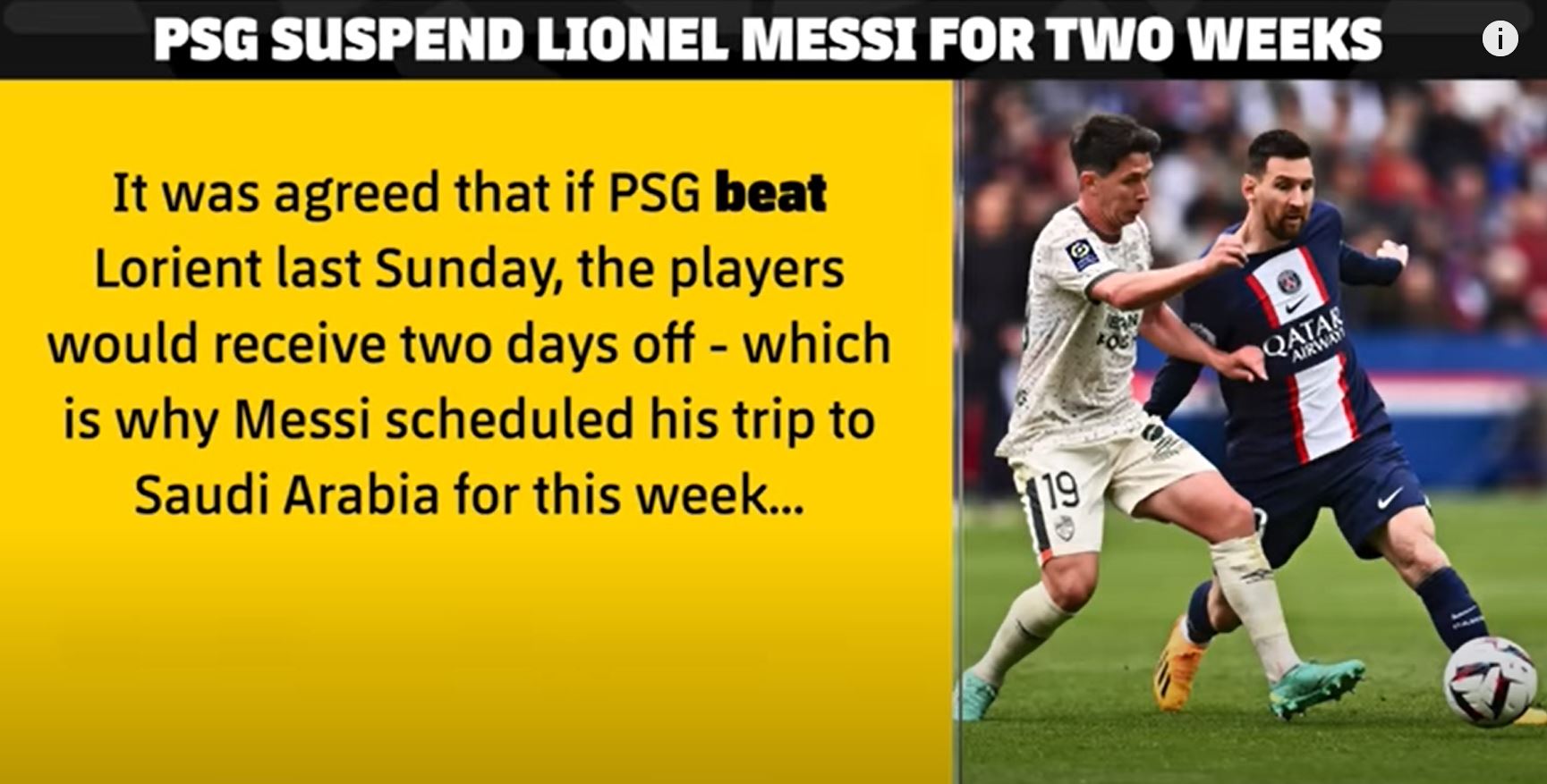 5월 3일 BBC 보도에 따르면, 메시는 PSG가 3-1로 패한 로리앙과의 최근 경기 후에 사우디아라비아로 여행하는 것에 대한 허락을 구단에 요청했습니다. 하지만, 그의 요청은 거절되었습니다. 메시는 허락을 받지 못했음에도 불구하고 사우디 관광 대사 자격으로 리야드를 방문했고, 그 결과 구단으로부터 징계를 받았습니다.