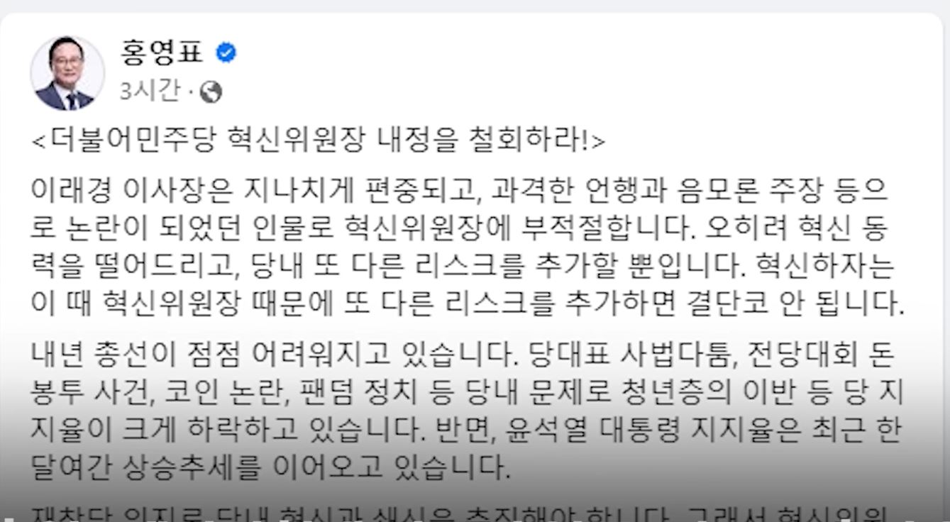 몇 시간전 당 내 혁신 기구의 수장으로 임명됐었던 이래경은 다른백년 명예 이사장으로서 SNS나 언론 기고를 통해 극좌·반미 성향의 '과격 발언'들이 계속 공개되었고, 이에 따라 당 내에서도 임명 철회를 요구하는 목소리가 나왔습니다.