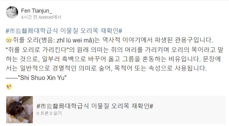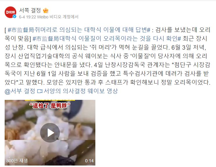 중국의 한 대학 식당에서 쥐머리가 발견되었으나 당국은 이를 오리고기로 확인한 조사 결과를 발표했습니다. 이에 중국 누리꾼들은 당국의 일방적인 결론을 조롱하는 풍자 게시물을 작성하고 있습니다.