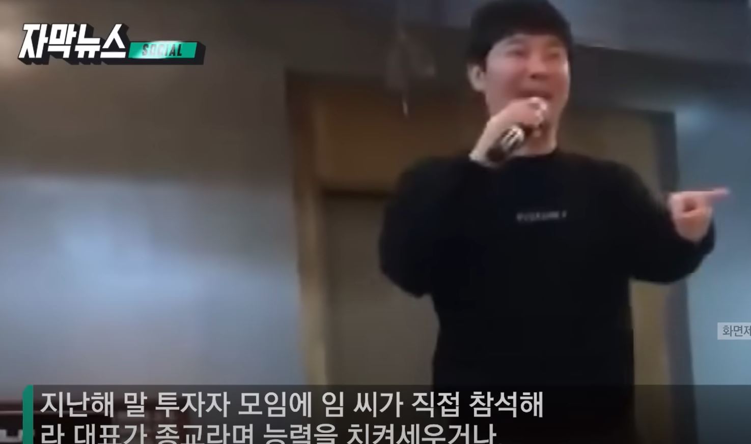 임창정은 지난해 12월, 주가조작 세력이 세운 골프회사에서 연 투자자 모임에 참석하여 청중들을 향해 투자금을 더 넣도록 유도하는 발언을 한 영상이 유포돼 논란을 일으켰는데요 당시 임창정은 라덕연 대표를 '종교'와 같다고 비유하며 "너 잘하고 있어. 왜냐면 내 돈을 가져간 저 XX 대단한 거야"라고 말했습니다. 그리고 "너 다음 달 말까지, 한 달 딱 줄 거야. 수익률 원하는 만큼 안 주면 내가 다 이거 해산시키겠다"며 "위대하라! 종교가 이렇게 탄생하는 것"이라고 덧붙였습니다.