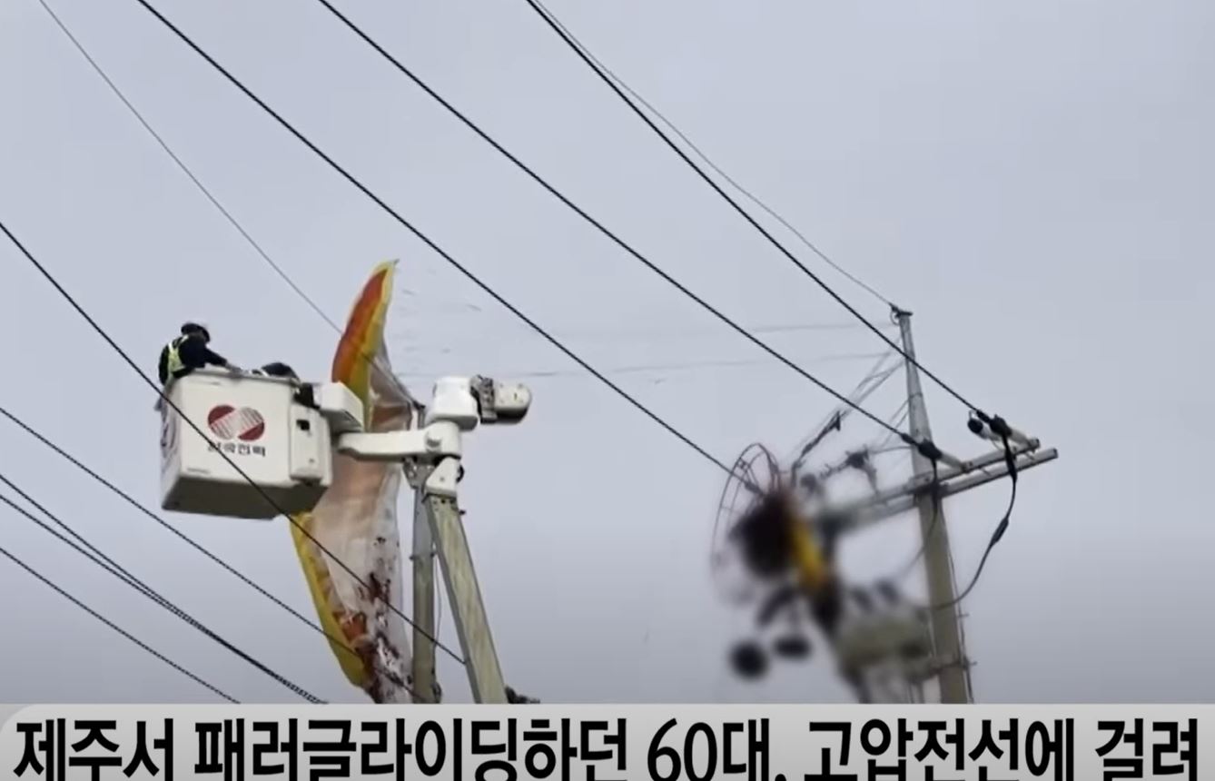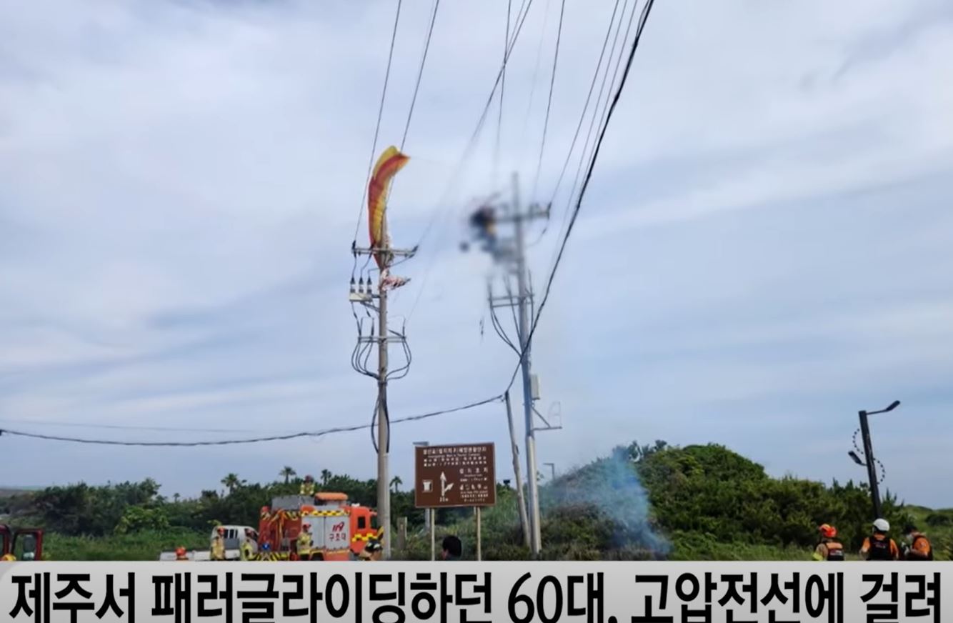 제주도에서 패러글라이딩을 즐기던 60대 관광객이 고압 전선에 걸려 숨지는 사고가 발생했습니다.