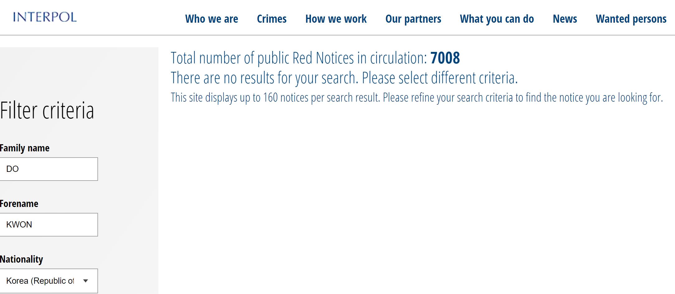 현지 매체들도 여러 차례 인터폴 웹사이트를 통해 확인해 본 결과, 권 씨와 관련된 어떠한 정보도 찾을 수 없었다고 합니다.